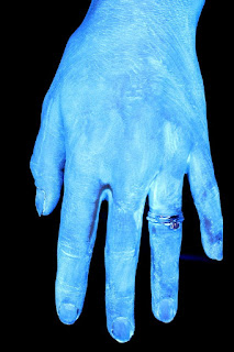 - Так выглядит рука в ультрафиолетовом освещении после нанесения лосьона.