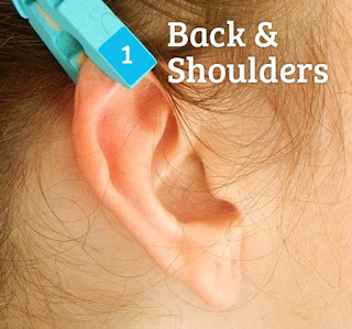 Верхняя часть уха отвечает за спину и плечи. Если вы чувствуете в этих областях напряжение и боль, прицепите к уху прицепку в зону 1. Уже через минуту вы почувствуете, что напряжение понемногу спадает. Повторяйте “процедуру” несколько раз в день, и вы заметите улучшение состояния.